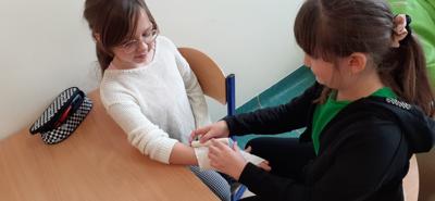 W ramach zajęć ppp uczniowie klas 1-7 uczestniczyli w projekcie ,,Ratujemy i uczymy ratować WOŚP".Wspolnie z panią Anną Cywińską uczniowie uczyli się jak pomóc osobie poszkodowanej. Podczas zajęć uczniowie ćwiczyli się bandażowanie oraz resuscytacji krążeniowo - oddechowej na fantomie dziecka.