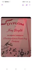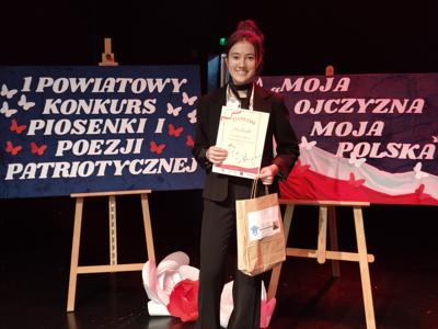 W dniu 2O listopada odbył się w Miejskim Ośrodku Kultury, w formie uroczystego koncertu, etap powiatowy 1 Powiatowego Konkursu Piosenki i Poezji Patriotycznej organizowany przez SP 14 im. Henryka III. Głogowskiego przy wsparciu Prezydenta Miasta Głogowa oraz Miejskiego Ośrodka Kultury. Nasza uczennica NINA BARYLIK z klasy 7 e otrzymała I miejsce w kategorii: poezja klas 7-8. Nina przygotowała wiersz Antoniego Słonimskiego ” Alarm”. Bardzo serdecznie gratulujemy Ninie i cieszymy się z Jej sukcesu. Liczymy, że za rok również weźmie udział w 2 edycji konkursu.