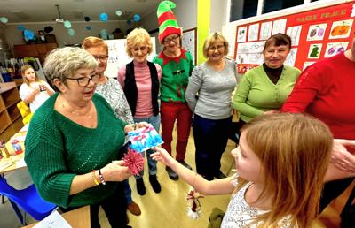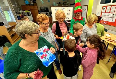 Naszymi gośćmi były panie z Fundacji Lokalnych Inicjatyw Społecznych - Pani Gabriela, Anna, Hanna, Wanda, Cecylia, Melania oraz Kazimiera. Dzieci z zainteresowaniem przyglądały się pracy seniorek i aktywnie brały udział w warsztatach. W ramach podziękowania dzieci wręczyły gościom własnoręcznie wykonane laurki.