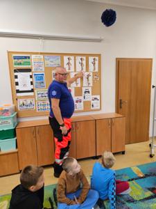 Naszym gościem specjalnym był ratownik medyczny Pan Michał Konys. Dzieci przypomniały sobie numery alarmowe, procedurę zgłaszania wypadku, układania