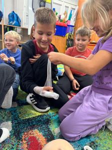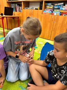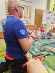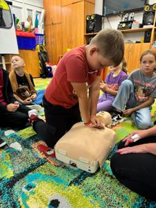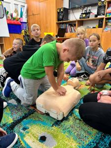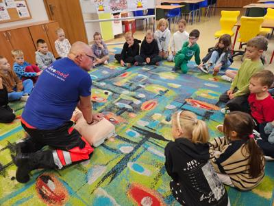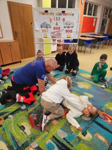 poćwiczyć wykonanie resuscytacji na fantomie oraz opatrywanie ran na różnych częściach ciała. Dzieci wysłuchały także dedykowanego wierszyka od