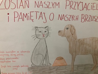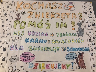 LISTOPAD - AKCJA pod hasłem ,, Kocham zwierzaczki" . Samorzad Uczniowski przeprowadził akcje , której celem było zebranie i przekazanie karmy, akcesorii oraz ciepłych kocy dla potrzebujących zwierząt. Członkowie samorzadu przygotowali plakaty informacyjne. 30 listopada przekazano zbiórkę Stowarzyszeniu Amicus