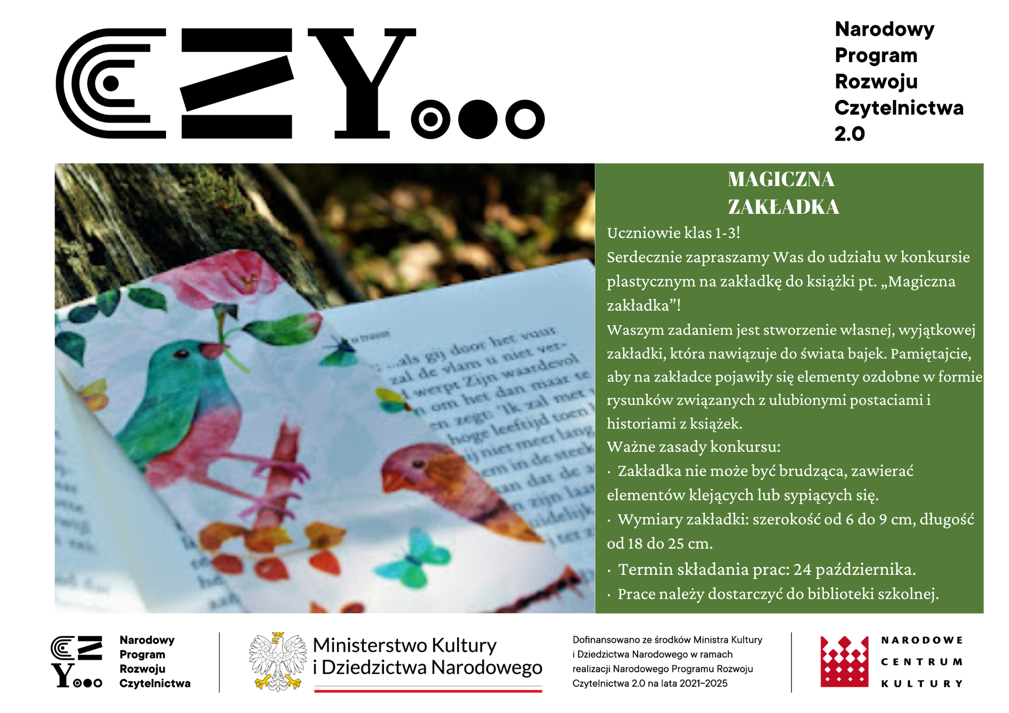 Konkurs plastyczny dla klas 1-3 "Magiczna zakładka" Załączniki magiczna_zakladka_1.png [1.31 MB] Zobacz również ,, Tu jest mój dom"- konkurs plastyczny I Powiatowy Konkurs Plastyczny " Portret Henryka... Rodzinny konkurs na mola książkowego dla biblioteki Konkurs plastyczny dla klas 1-3 "Magiczna zakładka" Konkurs plastyczny dla klas 4-8 "Projekt okładki"