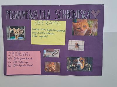 Podczas akcji (listopad-grudzień 2023 r) uczniowie naszej szkoły zebrali dużą ilość karmy dla zwierząt mieszkających w schroniskach. Zebrali również koce, zabawki i akcesoria dla zwierząt. Uczennice z wolontariatu działającego na terenie szkoły wykonały plakaty zachęcające do zbiórki. Zbiórka odbywała się w salach: 100 – pani Naskręt, 307 – pani Cwynar, 309 – pani Bartczak. Zebrane rzeczy zostały przekazane do Schroniska Miejskiego dla Bezdomnych Zwierząt w Głogowie. Szkoła otrzymała Certyfikat za pomoc oraz dary. Dziękujemy wszystkim uczniom i ich rodzicom za udział w akcji.