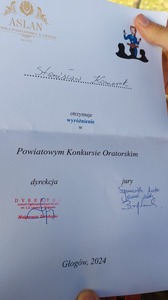 10 stycznia 2024 r. uczeń klasy 8 a- Stanisław Komorek wziął udział w I Powiatowym Konkursie Oratorskim organizowanym przez Liceum Aslan. Konkurs polegał na wygłoszeniu przemówienia na wybrany lub wylosowany temat.Staś podjął temat wpływu internetu w życie młodych ludzi.Otrzymał wyróżnienie i zdobył kolejne doświadczenie.W czasie obrad jury odbył się wykład pani Liliany Radkiewicz z Uniwersytetu Mikołaja Kopernika w Toruniu na temat: "Językowe kłopoty z feminatywami".Już zgłosiliśmy udział w tym konkursie za rok!
