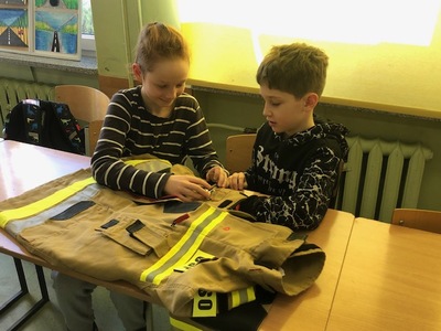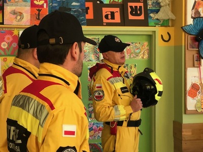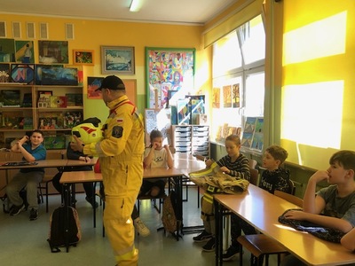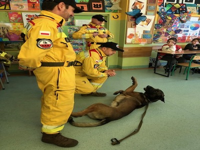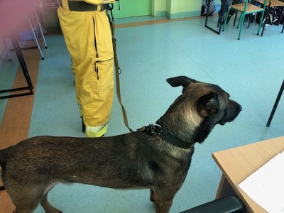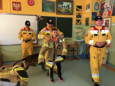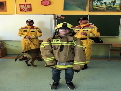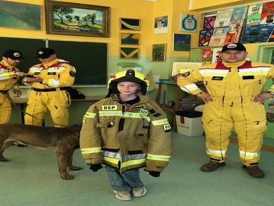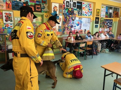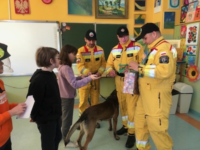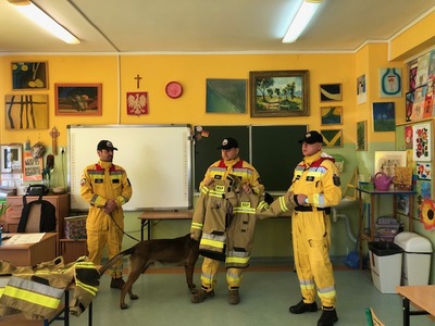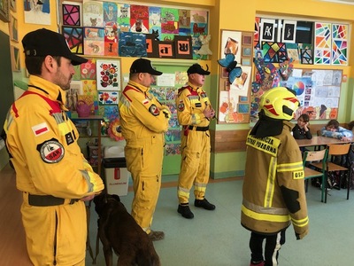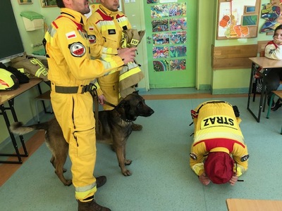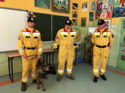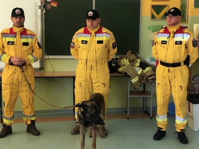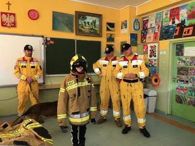 Dnia 8 marca naszą szkołę odwiedziła Grupa Ratownictwa Specjalnego Ochotniczej Straży Pożarnej Smardzów z psem ratowniczym Mildotem – owczarkiem belgijskim, który uczestniczy w akcjach poszukiwawczych. W spotkaniu udział wzięła klasa 4a, która z wielkim zaangażowaniem oraz zainteresowaniem uczestniczyła zajęciach. Strażacy pan Paweł Woźniak, Tomasz Kamiński oraz Michał Adamczyk w ciekawy i interesujący sposób opowiedzieli na czym polega ich praca, jakie są wymagania, omówili także zasady bezpieczeństwa. Uczniowie mogli w ramach zajęć przymierzyć stroje strażackie oraz kask strażacki a także pogłaskać Mildota – pieska ratowniczego. Uczniowie w ramach podziękowanie przygotowali dla strażaków upominki samodzielnie wykonane.