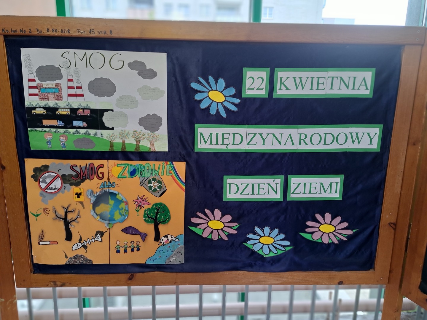 Z okazji Międzynarodowego Dnia Ziemi uczniowie klas VII wykonali projekt ekologiczny nt. „Smog – cichy zabójca”. Projekt polegał na wykonaniu prac plastycznych i zawarciu w nich informacji na temat smogu. Projekt został zrealizowany w ramach lekcji biologii. Prace uczniów zostały umieszczone na tablicach budynku szkolnego i posłużyły do edukacji społeczności szkolnej. Uczniowie klas IV -VI, korzystając z tych widomości mogli uzupełnić krzyżówkę tematyczną – zadanie dla chętnych. Wielu uczniów podjęło się tego zadania – podczas przerw lekcyjnych studiowali materiały edukacyjne na tablicach szkolnych. Efektem ich pracy były oceny celujące z biologii lub geografii. Na lekcjach geografii w klasach V – VIII zostały wyświetlone filmy o zanieczyszczeniu powietrza (smog) oraz Dniu Ziemi.