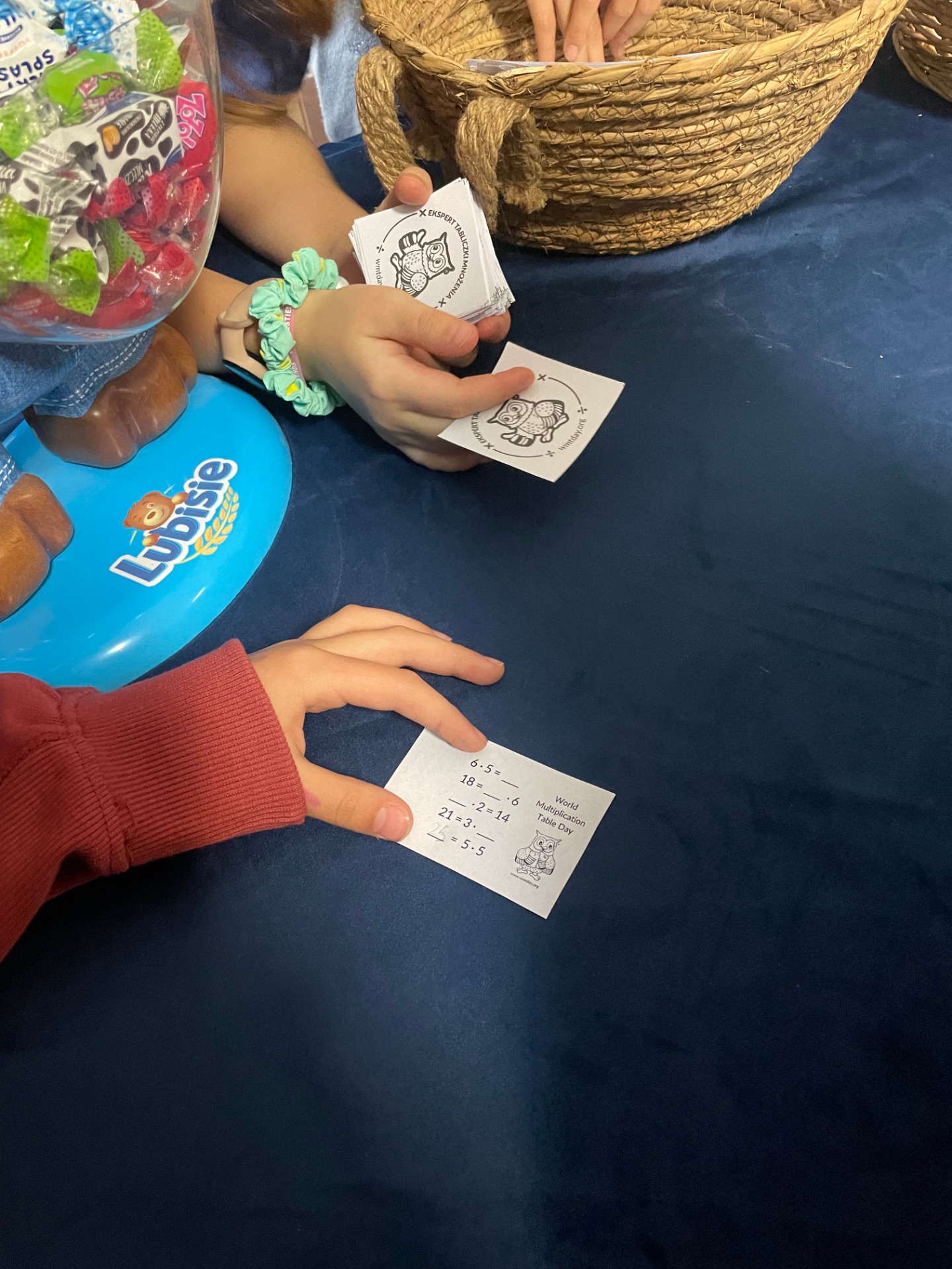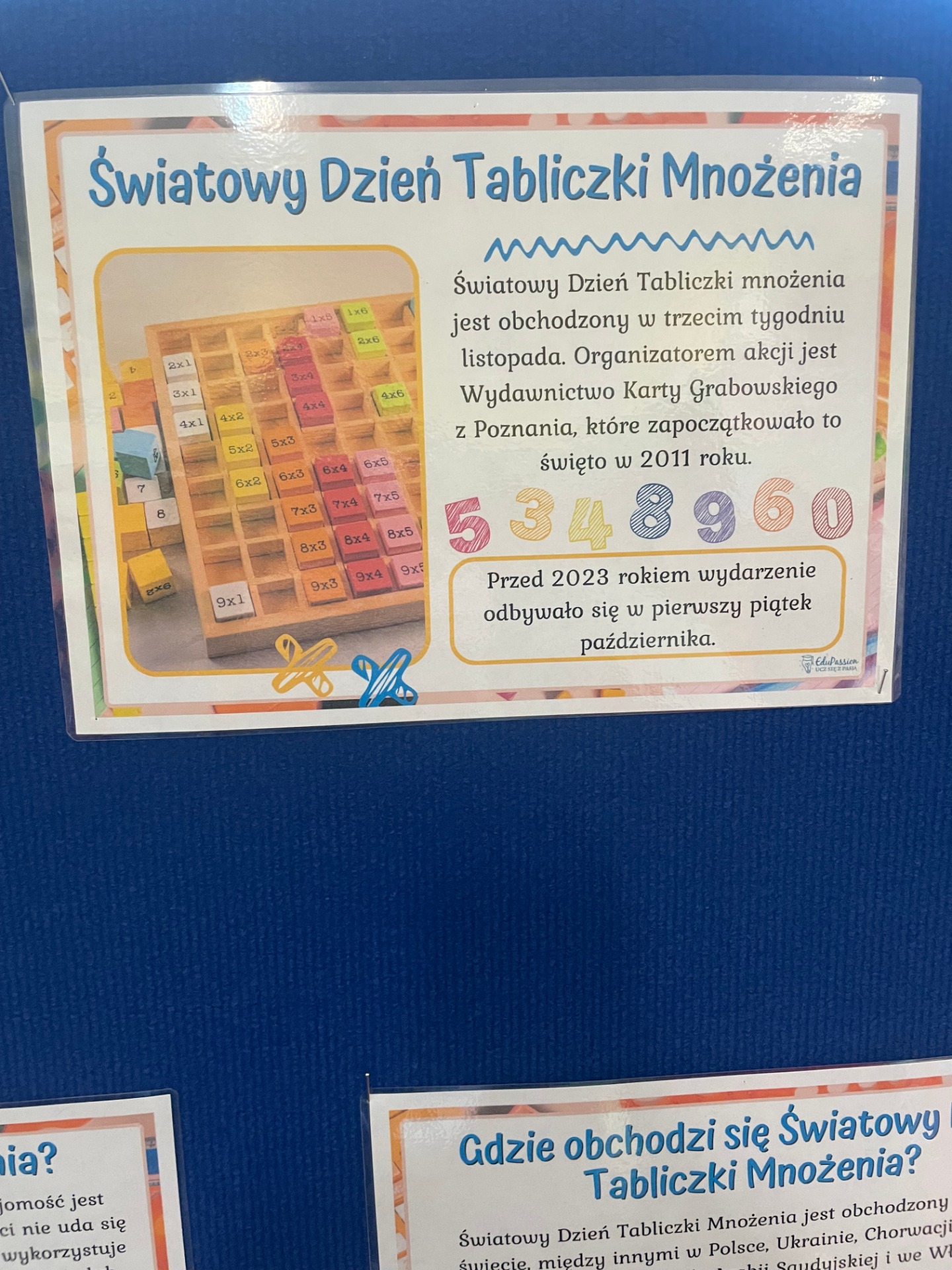 15 listopada z okazji Światowego Dnia Tabliczki Mnożenia w naszej szkole odbyły się specjalne lekcje i przedsięwzięcia zachęcające do przypomnienia sobie tabliczki mnożenia w przyjemny, niecodzienny sposób. Dzień ten przebiegał pod hasłem ,,Młodzi sprawdzają, czy starsi tabliczkę mnożenia znają”. Podczas przerw śródlekcyjnych uczniowie klasy 3d odpytywali nauczycieli, pracowników szkoły oraz swoich starszych kolegów i koleżanki ze znajomości tabliczki mnożenia. Celem akcji było propagowanie zabawowej formy nauczania-uczenia się matematyki oraz okazją dla uczniów do nadrobienia „tabliczkowych” zaległości.
