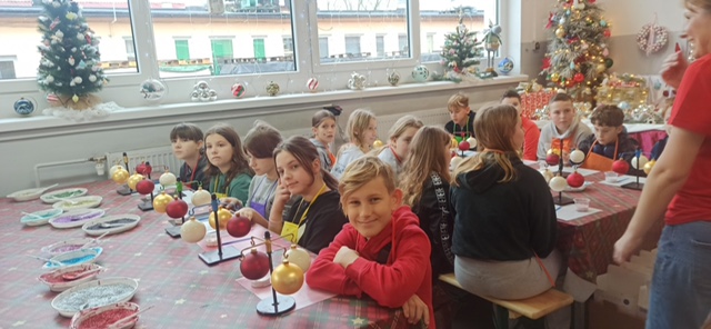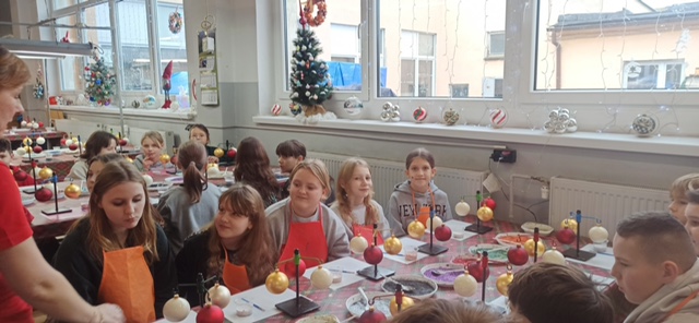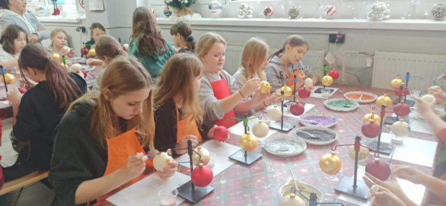 Podczas zwiedzania fabryki, w której produkcja bombek odbywa się ręcznie, ucznowie zapoznali się również z procesem powstawania ozdób choinkowych. Zwiedzanie fabryki obejmowało cały proces twórczy, zaczynając od szklanej rurki aż do etapu końcowego uzyskania ręcznie malowanych, pięknie zdobionych bombek.Po zwiedzaniu wszystkich działów technologicznych dla uczniów przygotowano warsztaty z samodzielnego malowania bombek. Każdy uczeń otrzymał do dekoracji trzy bombki. Wszystkie samodzielnie wykonane bombki były pakowane. Każdy uczestnik wycieczki otrzymał ręcznie malowaną szklaną bombkę ze swoim imieniem.