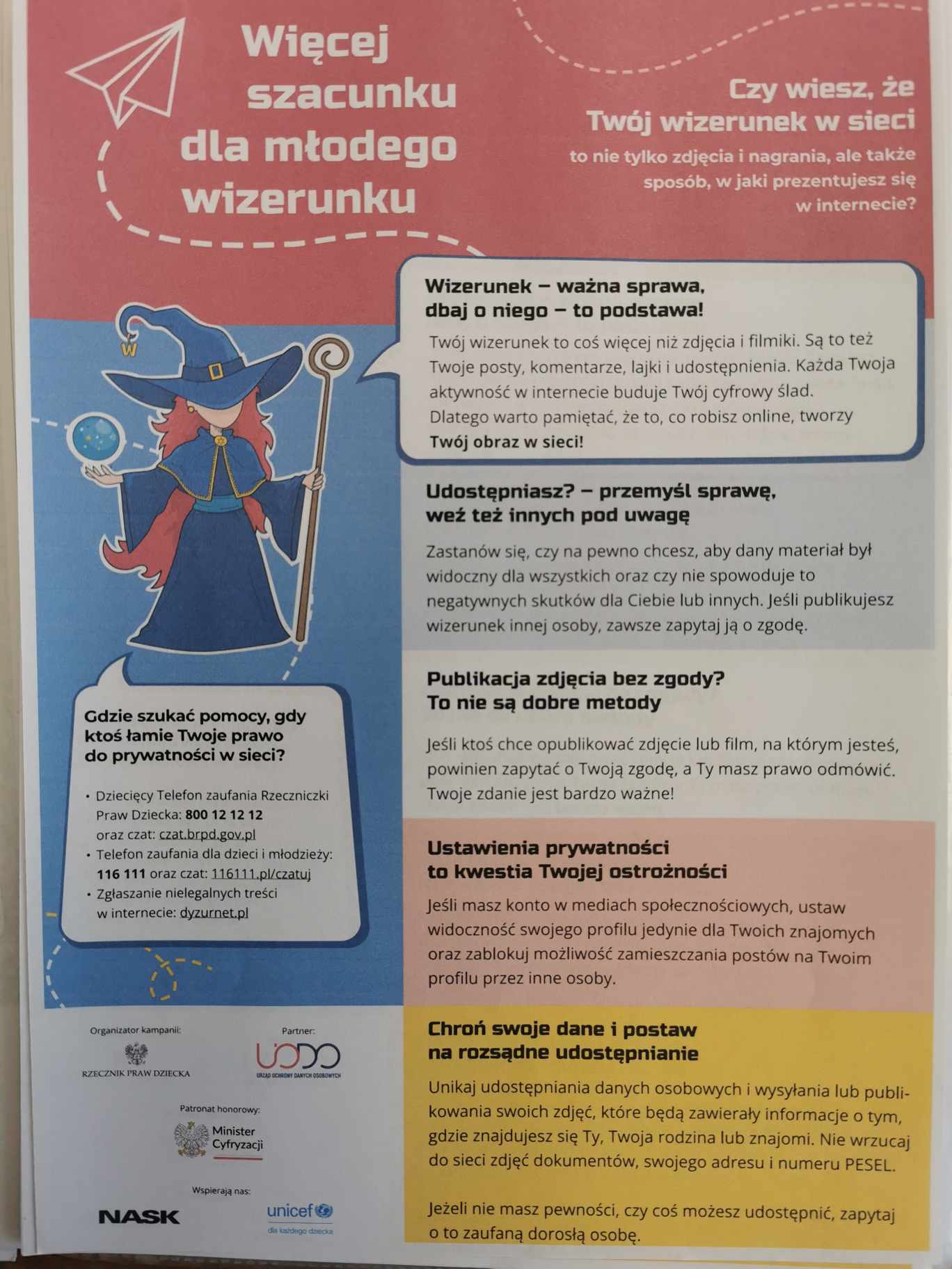 Nasza szkoła przystąpiła do udziału w ogólnopolskiej kampanii "Więcej szacunku dla młodego wizerunku", której organizatorem jest Rzecznik Praw Dziecka. Jej celem jest podkreślenie fundamentalnego znaczenia ochrony wizerunku młodych osób w internecie - w trosce o ich bezpieczeństwo, prywatność oraz działania w duchu poszanowania ich praw. Bowiem wizerunek dziecka to nie tylko zdjęcie, to część jego tożsamości, prawa do prywatności i autonomii. Jako dorośli jesteśmy świadomi, że mamy obowiązek słuchać młodych ludzi. Rozmowa to nie tylko wyraz szacunku wobec dziecka, ale również edukacja w zakresie prawidłowego funkcjonowania w świecie cyfrowym.