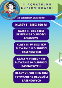 Dnia 24.09.2025 roku odbędzie się w naszej szkole II Aquatlon Kopernikowski po złoty teleskop. Pierwszy etap rozpoczną klasy I o godzinie 9.00 biegiem na 500 metrów . O godzinie 10.00 odbędzie się II etap -uroczyste otwarcie oraz udział w sztafecie pani Dyrektor Joanny Ołówek wraz z patronem panem Jerzym Górskim. Zapraszamy do wspólnej zabawy oraz kibicowania.