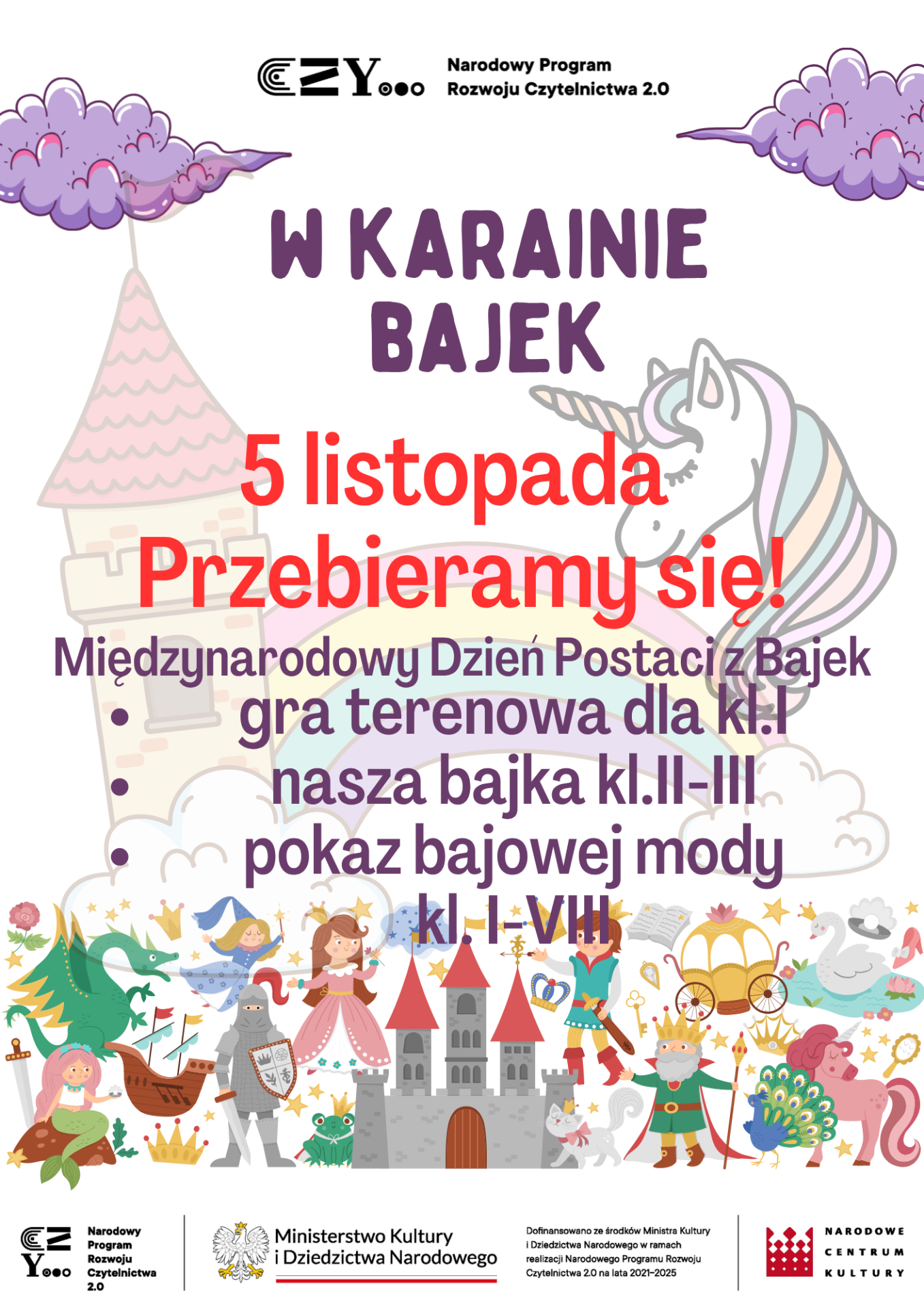 Międzynarodowy Dzień Postaci z Bajek 5 listopada, w dniu urodzin Walta Disneya, obchodzimy Międzynarodowy Dzień Postaci z Bajek. Serdecznie zapraszamy wszystkich uczniów, nauczycieli i pracowników szkoły do uczczenia tego dnia bajkowym przebraniem. Zdjęcia Zobacz również RODZINNY KONKURS NA MOLA KSIĄŻKOWEGO DLA... Wycieczka do Berlina Książka ma moc Międzynarodowy Dzień Postaci z Bajek Strażak ratownik uczy pierwszej pomocy Święto Niepodległości 03 listopada 2025 Aktualności Wydrukuj Udostępnij Wyświetlono: 98